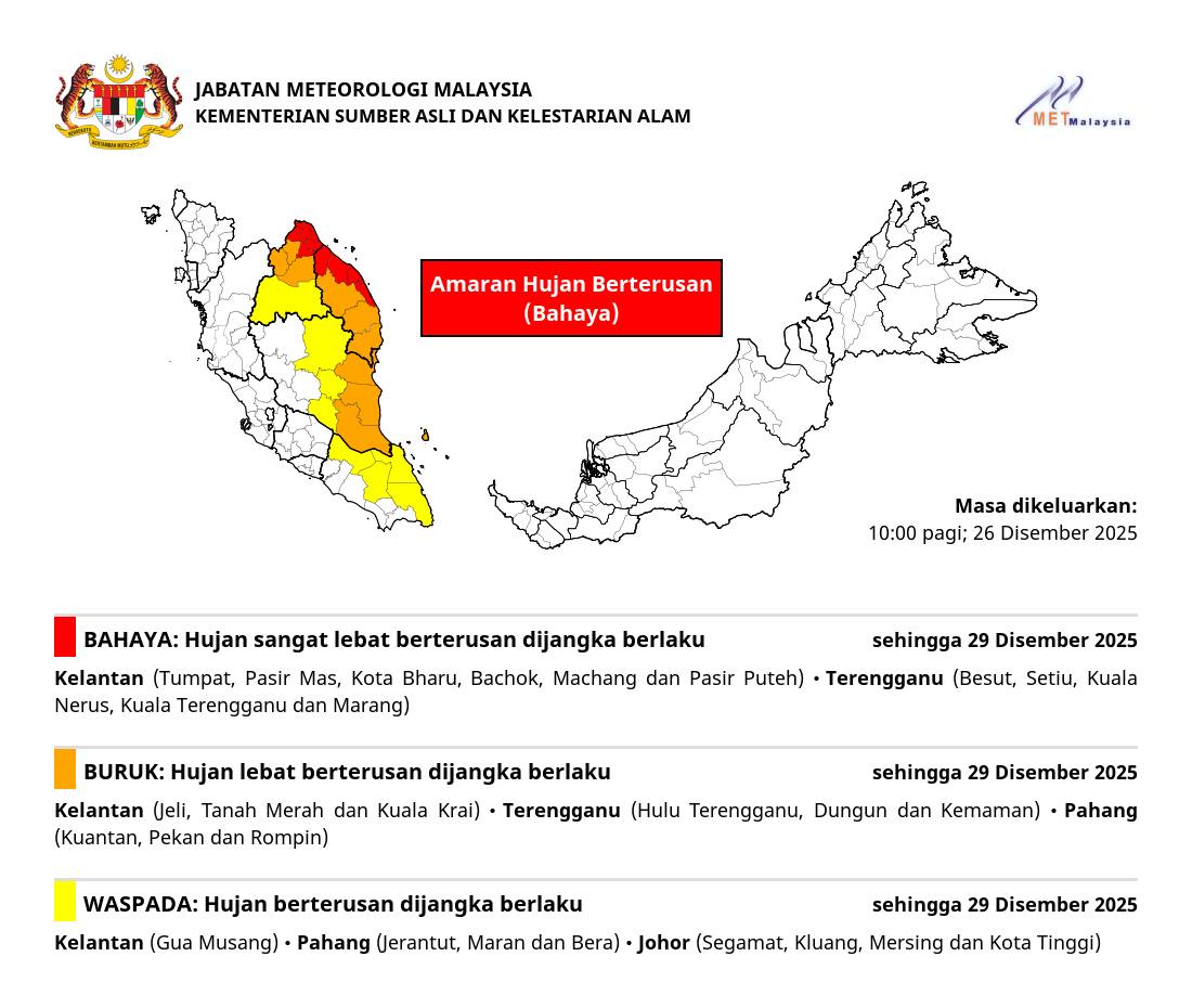 Departemen Meteorologi Malaysia (METMalaysia) hari ini mengeluarkan peringatan hujan terus menerus yang diperkirakan akan terjadi di beberapa wilayah hingga 29 Desember (Senin).