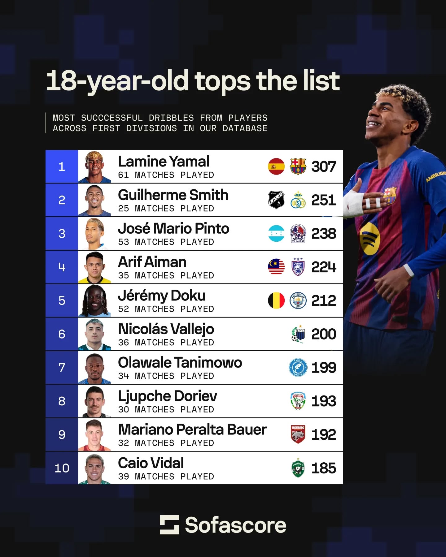 Melalui daftar tersebut, Arif yang bermain dalam 35 pertandingan mencatatkan 224 dribel.