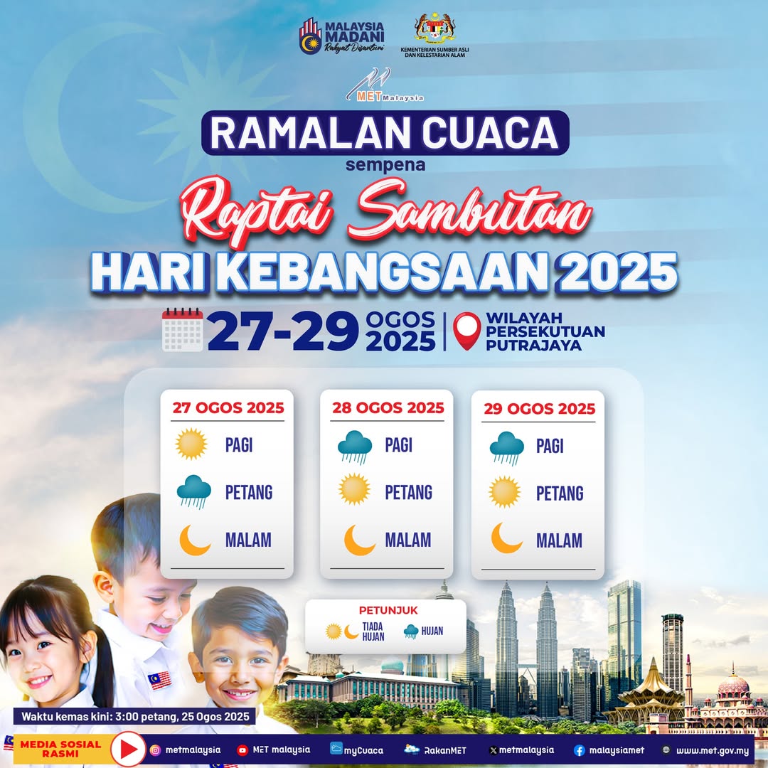 Departemen Meteorologi Malaysia (Metmalaysia) mengeluarkan ramalan cuaca bersamaan dengan perayaan Hari Nasional 2025 yang akan berlangsung dari 27 hingga 29 Agustus 2025 (Rabu hingga Jumat) di Lapangan Putrajaya.